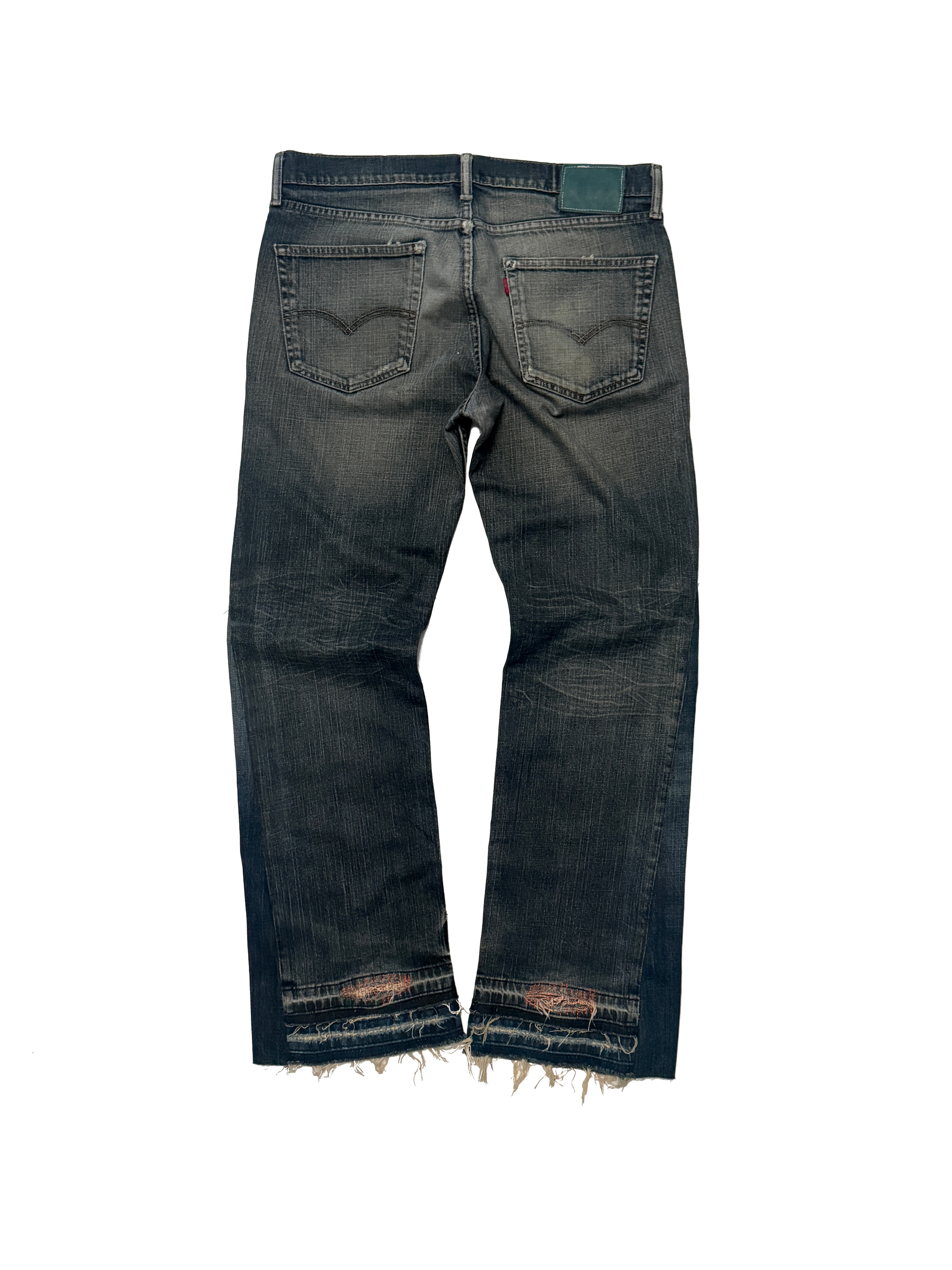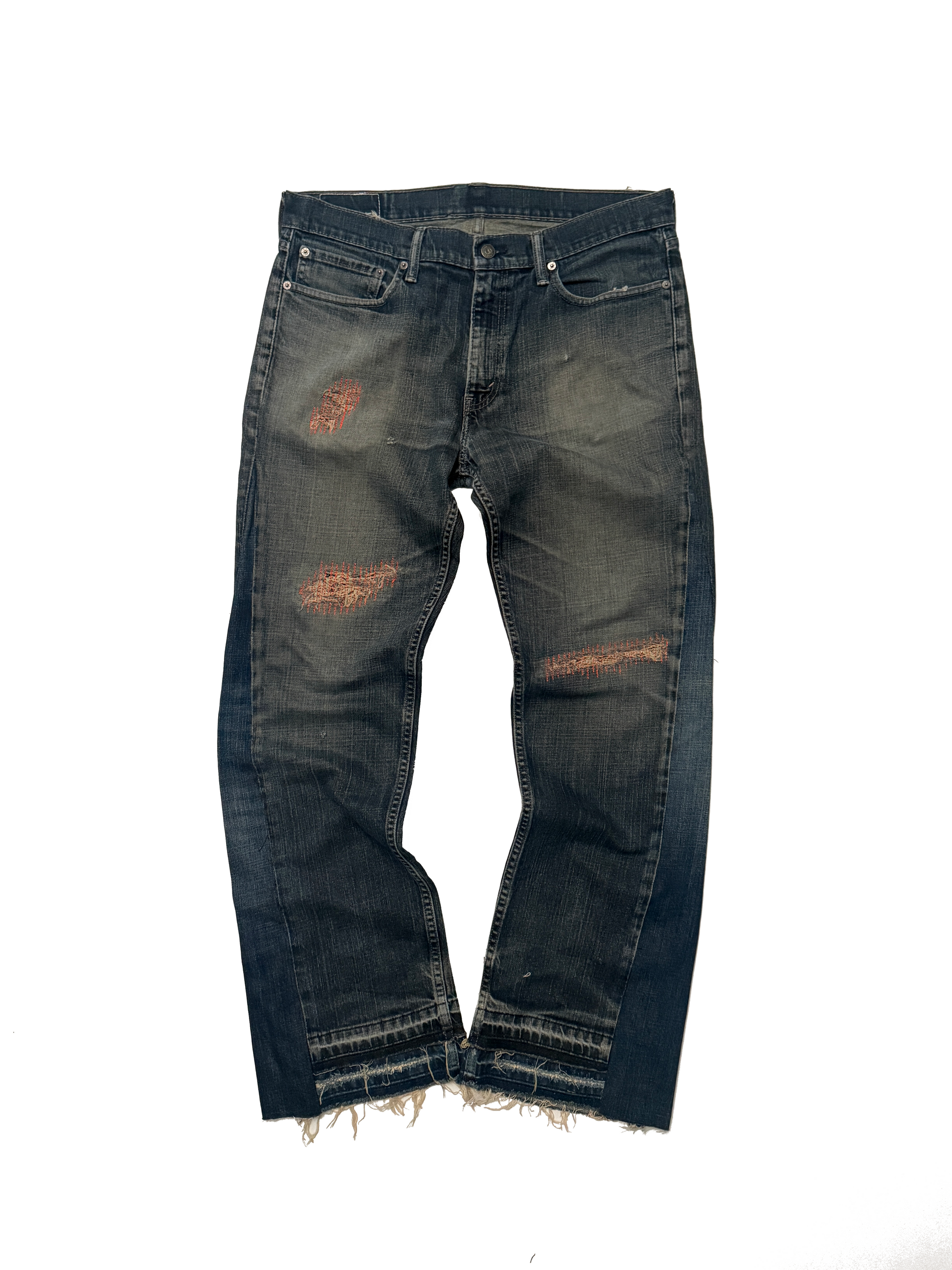 mid indigo wash with repaired holes and double hem flared